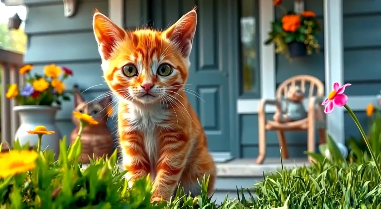 A lush sunny meadow in vibrant 3D animation, with animated green grass swaying gently, colorful wildflowers blooming vividly, and a bright blue sky dotted with fluffy white clouds, captured with smooth camera movement and warm lighting. The background audio features gentle bird songs and ambient nature sounds.